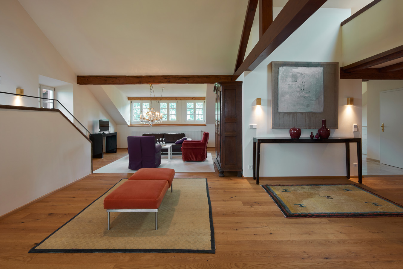 Geradezu prächtig zeigt sich der luxuriöse Wohnbereich im offen gehaltenen Dachgeschoss. Hier sind die Übergänge von Wohnen, Leben und Schlafen bewusst fließend gehalten.