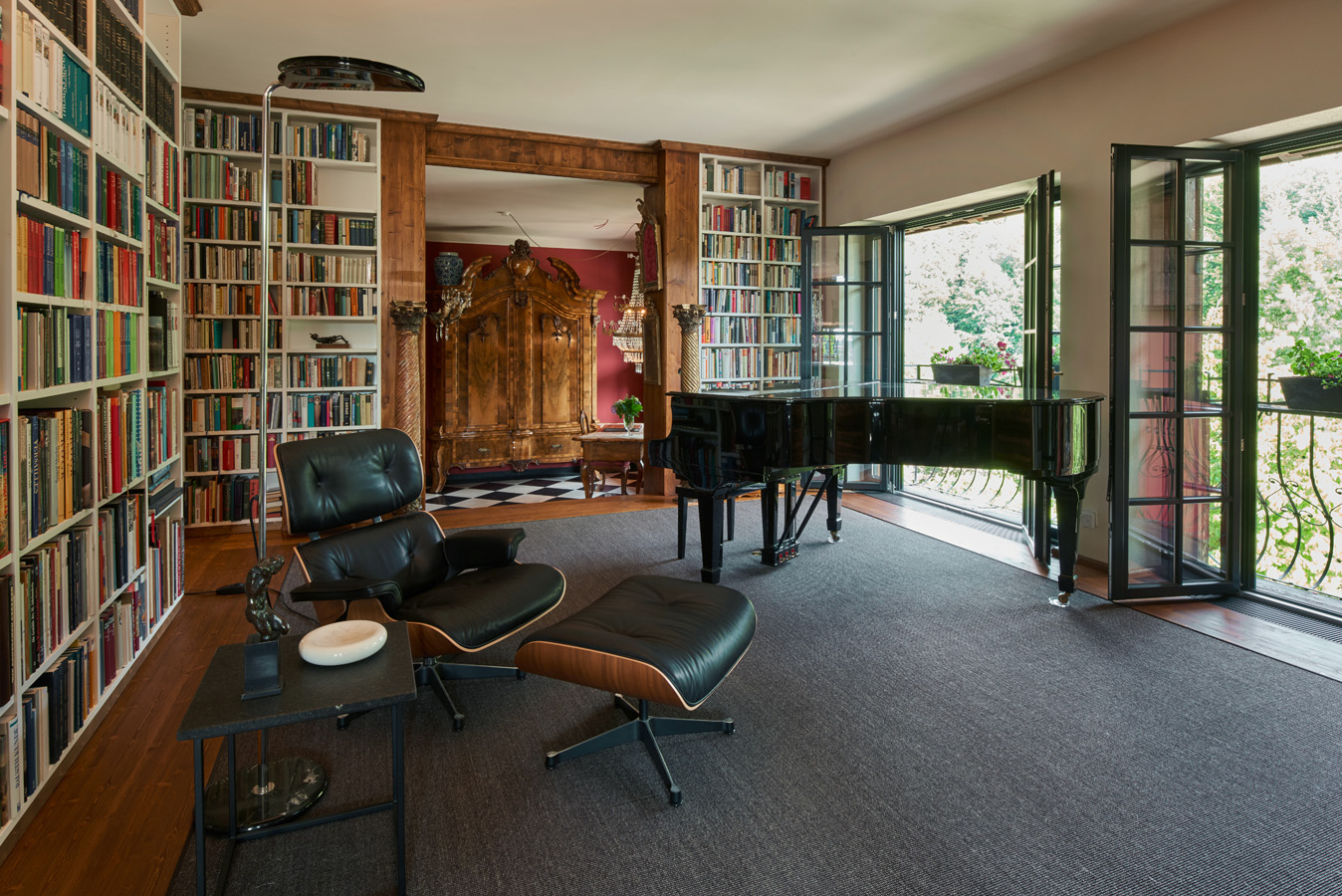 Im Herzen des Hauses kommt die Kultur zu ihrem Recht. Die Bibliothek mit Flügel offenbart eine gewollt zurückhaltende Eleganz. Große, bodentiefe Fenster ermöglichen den Blick in die Natur.