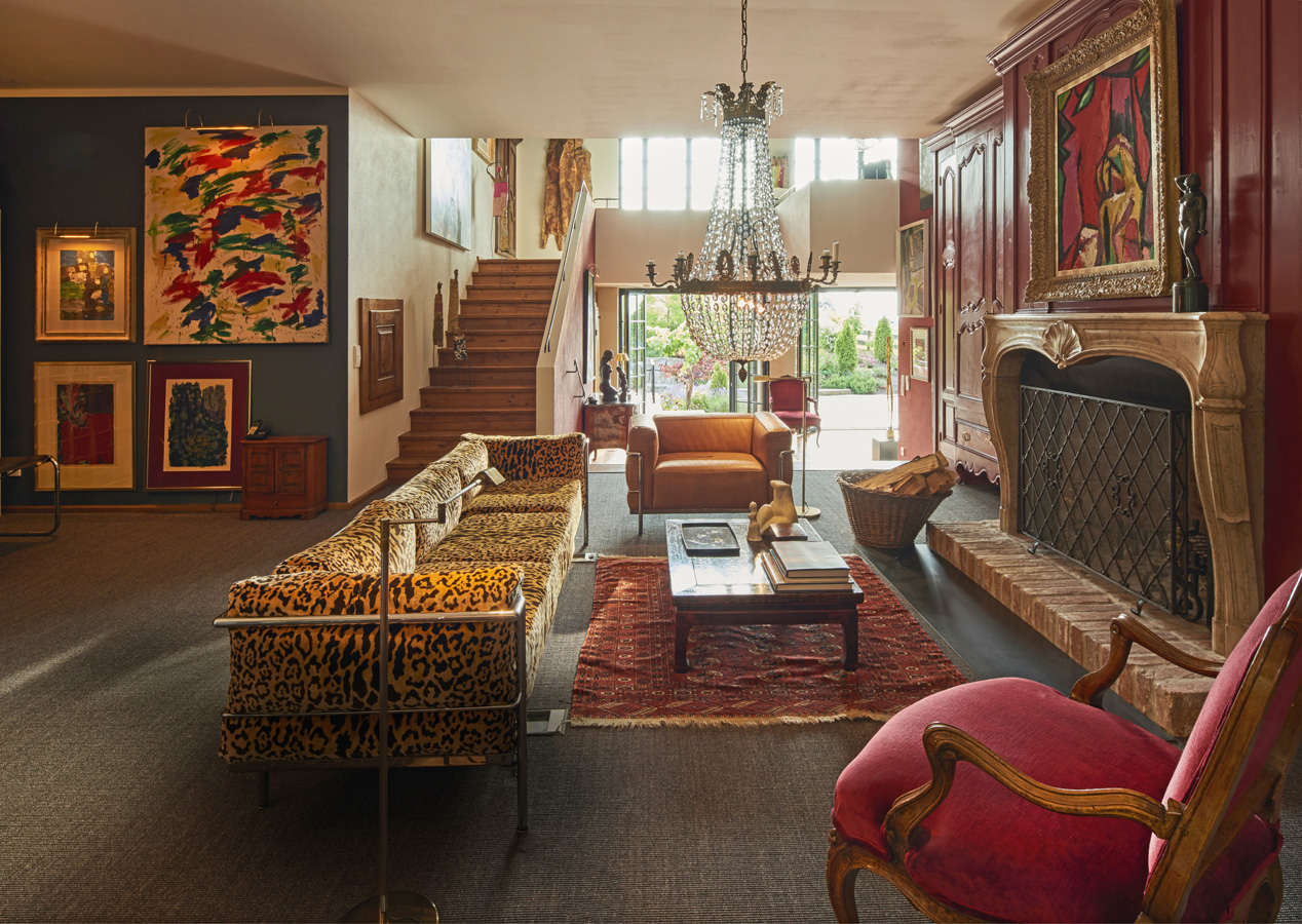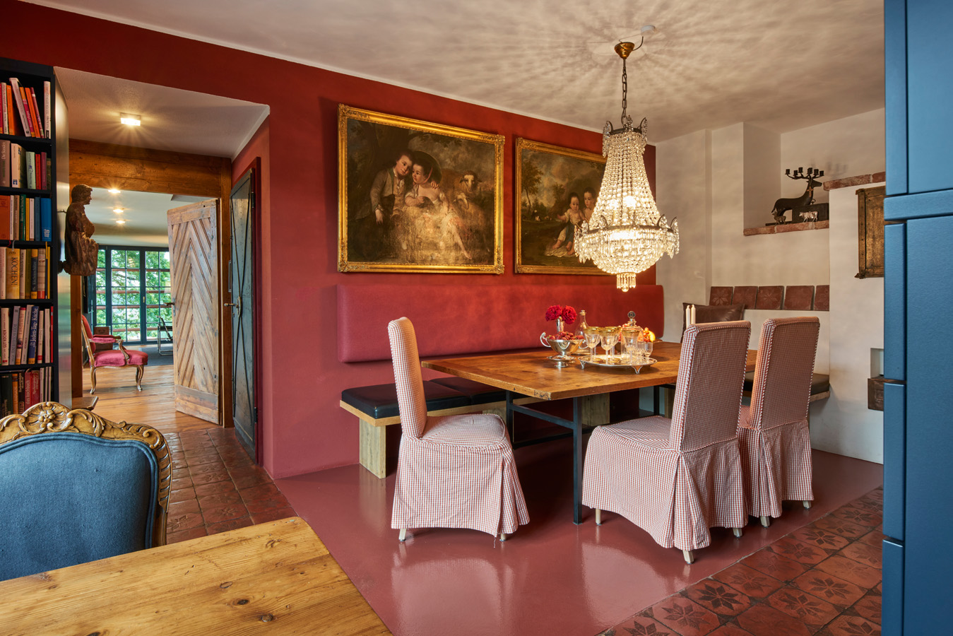 Das Innere des Anwesens wird von einer Symbiose aus Historie und zeitgenössischem Design bestimmt. Hinzu kommt eine Vielzahl wohnlicher Luxus- und Komfortelemente – alles in allem ein perfekter Mix, für den die Eigentümerin verantwortlich ist. Von Beruf Kunsthändlerin und Interieur-Designerin, spiegelt sich ihr exquisiter Geschmack im gesamten Haus wider. Mitunter wurden mutig Kontraste gesetzt, und doch wirkt alles stimmig und extrem ausgewogen. Nichts irritiert das Auge des Betrachters, alles greift stilvoll ineinander. In ihrem Farbkonzept für Gut Winkling dominieren archaische Töne wie Sienarot und Blaugrau.