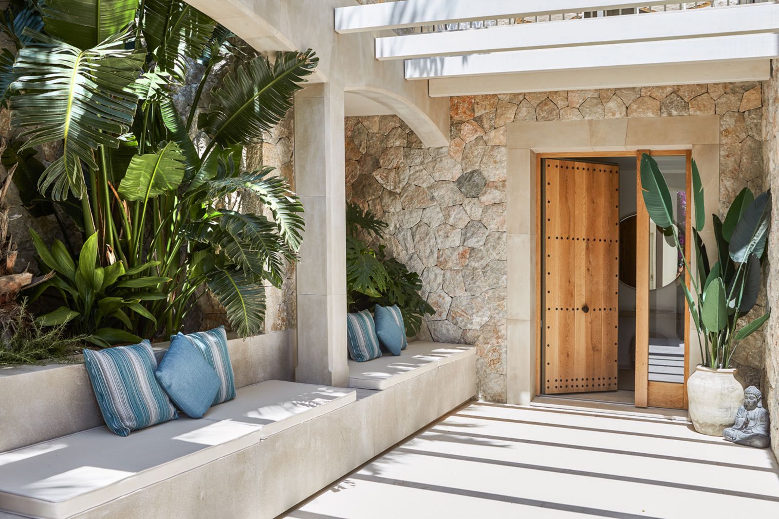 „Pura Vida“, übersetzt „pures Leben“, heißt das Anwesen, das mit architektonischer Finesse und Feingefühl auf einem nach Süden ausgerichteten, ca. 1.200 m2 großen Hanggrundstück errichtet wurde. Die Lage vereint Aussicht und Privatsphäre, „sehen, aber nicht gesehen werden“: Terrassen und die meisten Räume bieten Blick auf die Bucht von Port d’Andratx, sind aber von den Nachbargrundstücken nicht einsehbar.