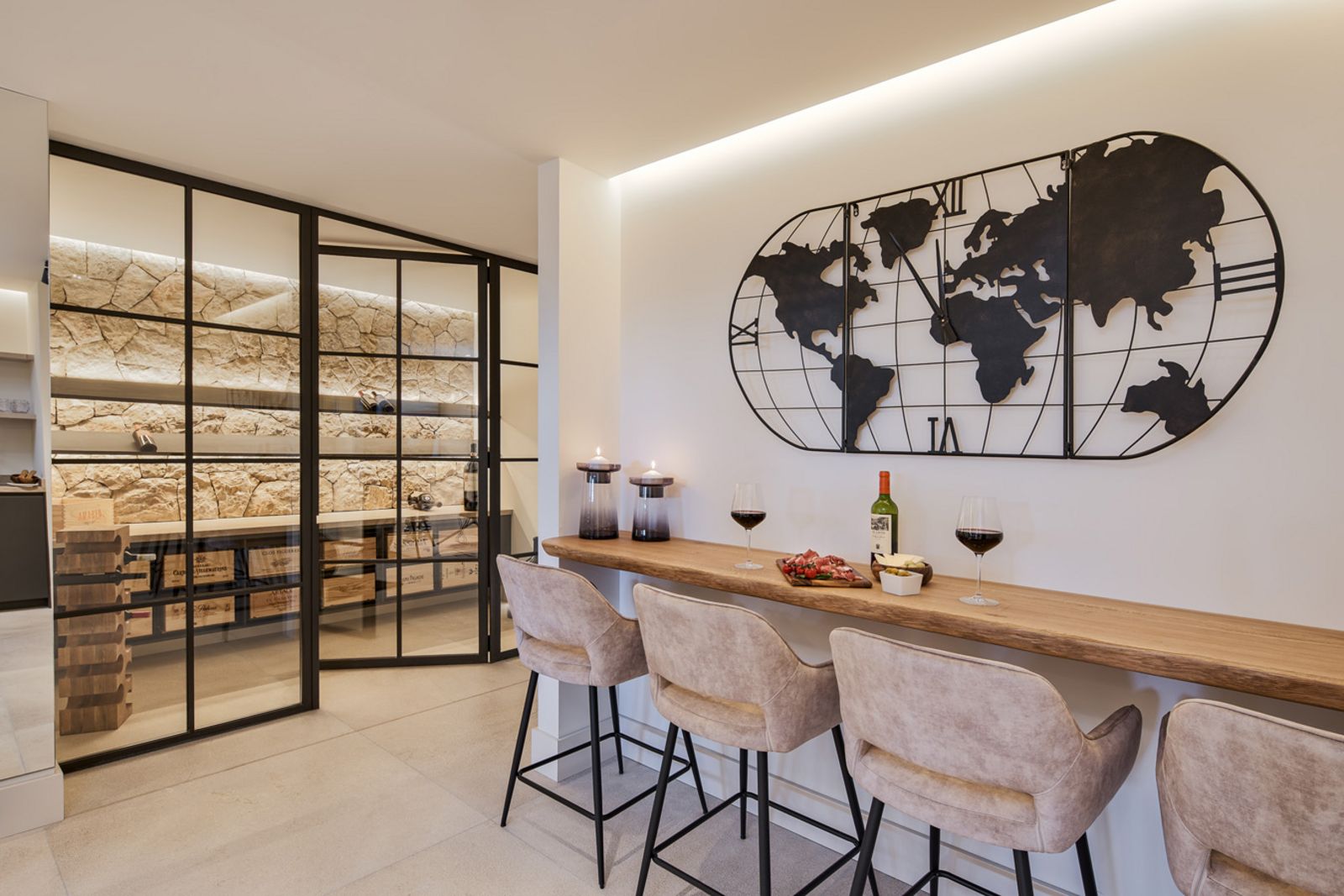 Mit dem Fahrstuhl sind von hier aus bequem die anderen Stockwerke zu erreichen. Im zweiten Geschoss befinden sich der Gästetrakt mit zwei Schlafzimmern und eigenen Terrassen sowie der Fitnessbereich mit Sauna, Spa-Dusche, Sportgeräten von Technogym und Yogazone. Gleich nebenan liegt die klimatisierte Bodega für die Weine.