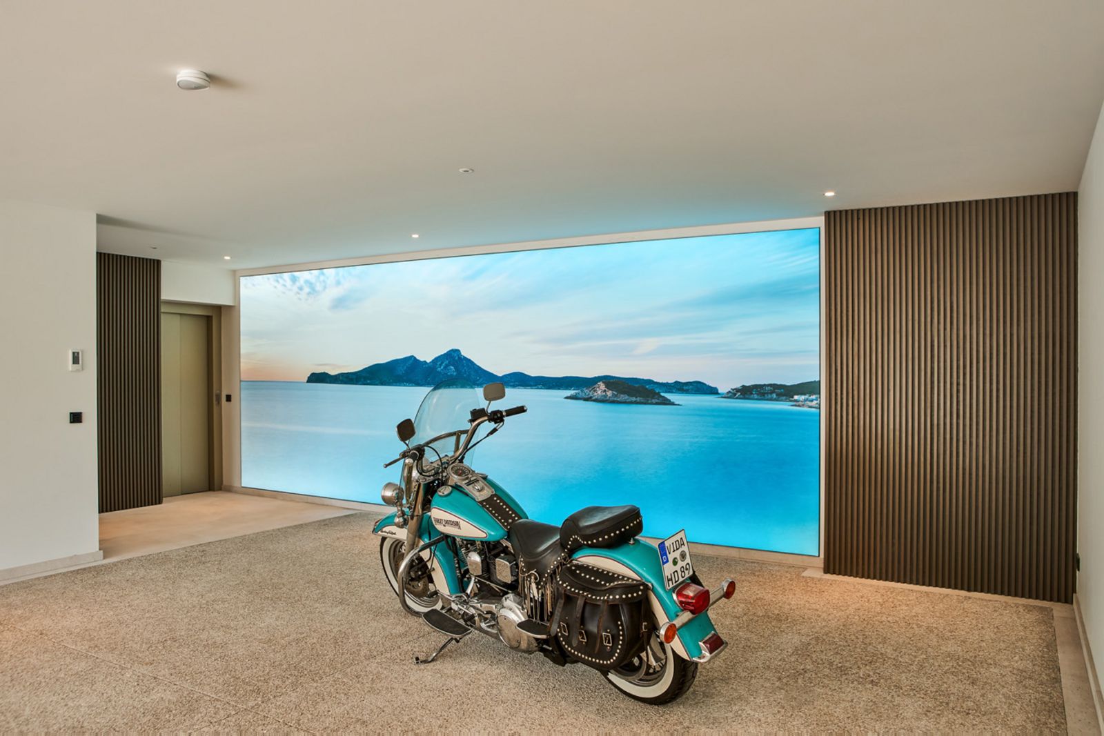Die Villa ist in vier Ebenen aufgeteilt. Von der Straße gelangt man durch ein schmiedeeisernes Tor und einen Patio zur geräumigen Garage mit Ladestation für E- Fahrzeuge und viel Platz für Autos, Motorräder, Motorroller, Fahrräder etc.