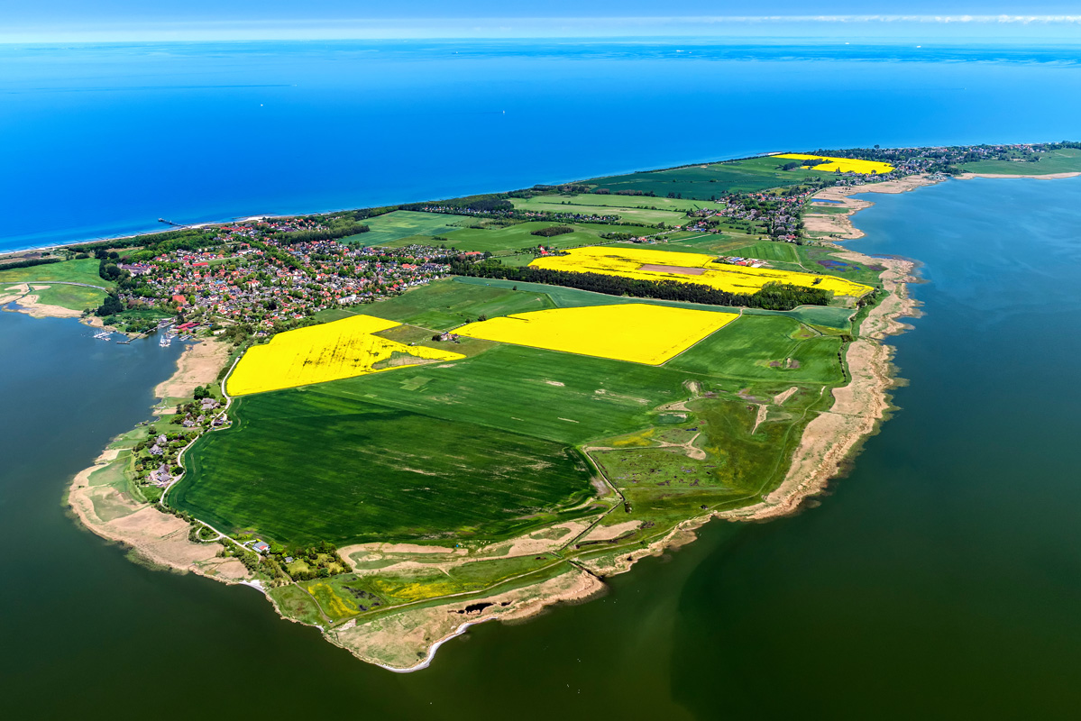 Weiter geht die Reise an der Festlandsküste mit Blick auf die zwölf Kilometer lange Halbinsel Wustrow (nicht zu verwechseln mit dem gleichnamigen Ort auf Fischland- Darß). Man darf gespannt sein, ob und wann der Inhaber, Immobilien unternehmer und Adlon-Erbauer Anno August Jagdfeld, etwas aus dieser schlafenden Schönheit macht. Sein ursprüngliches Vorhaben, hier ein Luxusresort mit Golfplatz und Marina zu erbauen, scheiterte nach einem Streit mit der Gemeinde Rerik.