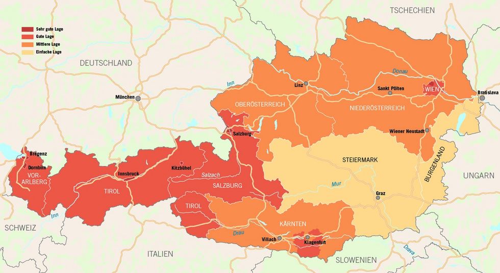 Den Löwenanteil an diesem beeindruckenden Transaktionsvolumen hat die Hauptstadt. Knapp zwei Millionen Menschen leben in der Donaumetropole, das ist knapp jeder vierte Österreicher. Bei den Immobilienwerten entfiel mit gut 12 Milliarden Euro sogar rund ein Drittel auf die Donaumetropole mit ihren 23 Stadtbezirken. Teuerste Lage ist der erste Bezirk mit dem historischen Zentrum, die Quadrat-