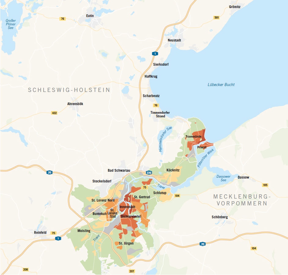 Lübeck besteht aus insgesamt zehn Stadtteilen, die zum Teil riesige Ausmaße haben. Bestes Beispiel ist St. Jürgen, eine der oft genannten Spitzenlagen der Stadt. Dies bezieht sich jedoch ausschließlich auf den innenstadtnahen Bereich wie das Mühlentorviertel und nicht auf die weit im Sü- den befindlichen Bezirke Wulfsdorf oder Krummesse. Ähnlich verhält es sich beim Stadtteil St. Gertrud. Die Nähe zur Altstadtinsel (Burgtor) und zum Stadtpark ist absolut gefragt und kostspielig, andere Bereiche fallen preislich mitunter deutlich ab.