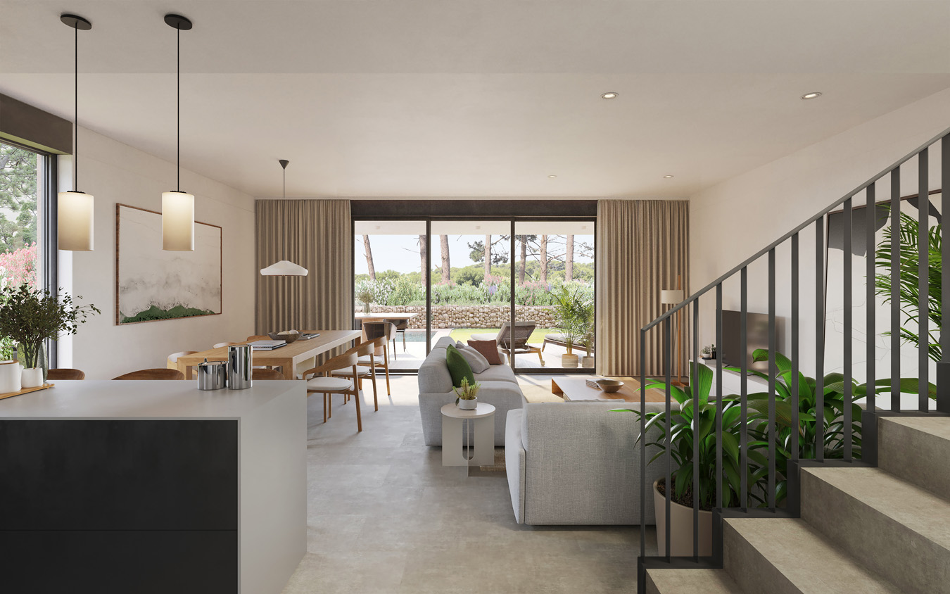 Zwischen Golfplatz und Beachclub liegt die Residential Area. Hier stehen beziehungsweise entstehen – maximal dreigeschossig, nicht höher als die Bäume – die Immobilien des Infinitum Resorts. Interessenten haben die Wahl zwischen Apartments, Reihenhäusern und Doppelhaushälften. Die mit Produkten von Marken wie Siemens, Hansgrohe, Duravit oder Porcelanosa ausgestatteten „LLevant“-Apartments haben Größen von 79 bis 154 Quadratmeter, zwei bis vier Schlafzimmer, zwei Bäder, großzügige Terrassen und zwei Tiefgaragen-Stellplätze. Zu jedem Apartmentkomplex gehört ein Gemeinschaftspool.