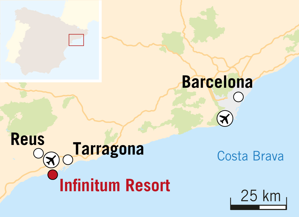 Etwa zehn Kilometer südlich von Tarragona befindet sich auf einer Halbinsel kurz vor dem beliebten und quirligen Badeort Salou das Resort Infinitum. Der lateinische Name bedeutet übersetzt „das Unendliche“ oder „das Unermessliche“. Das mag vielleicht sehr selbstbewusst klingen, aber das mehrere Quadratkilometer umfassende Areal der gepflegten Anlage ist zweifelsohne beeindruckend.