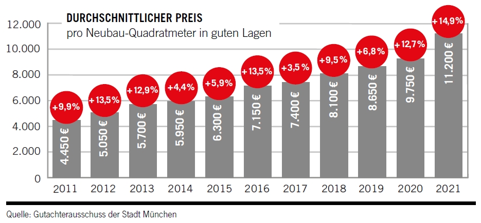 2011 lag der durchschnittliche Quadratmeterpreis für eine Neubauwohnung bei 4.450 Euro, 2021 bei 11.200 Euro – ein Plus von 152 Prozent