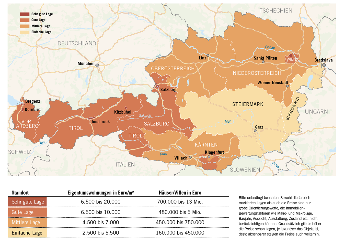 In Bestlagen wie Attersee, Wörthersee oder Kitzbühel können die Preise für exklusive Ferienwohnungen rasch mal eine oder mehrere Millionen Euro kosten. Erst unlängst wurde in Kitzbühel ein Haus für etwa 12,2 Millionen Euro verkauft. Ein österreichischer Rekord. Aber das ist buchstäblich nur die Spitze des Eisberges. Denn generell sind die Preise hier auf einem Niveau, wie man es sonst wohl eher aus dem relativ nahe gelegenen München kennt.
