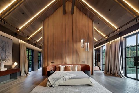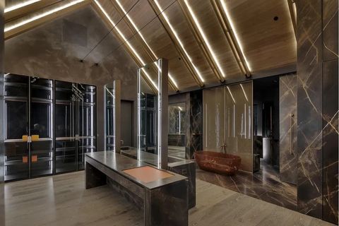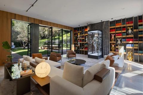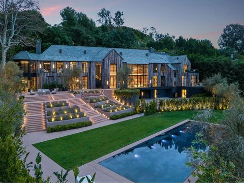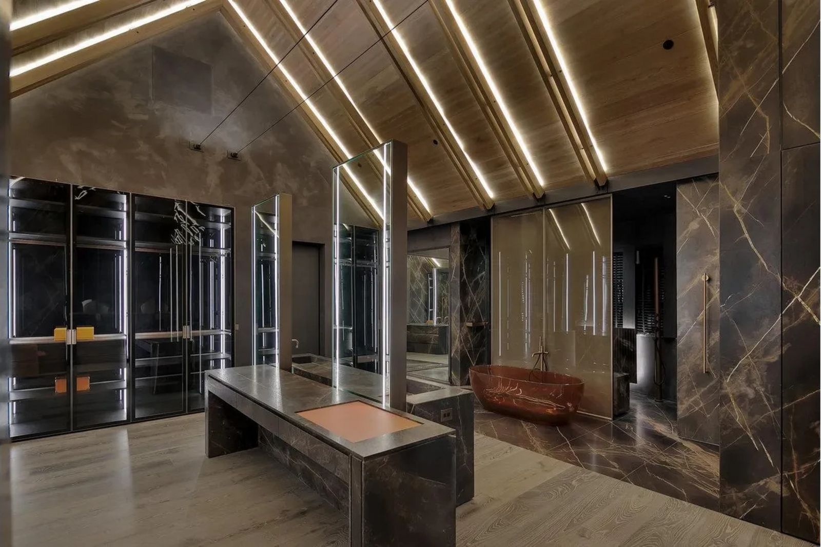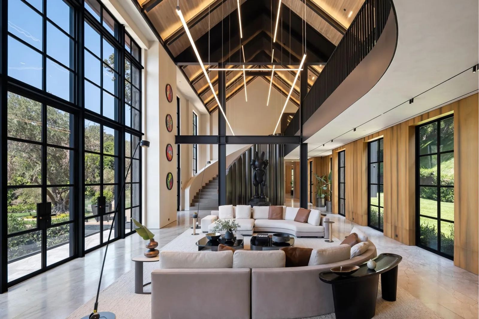 Doch was bekommt man eigentlich für sein Geld? In jedem Fall fällt diese moderne und sehr dunkle Scheune unter das Motto „Lebe lieber ungewöhnlich“. Im Listing heißt es: „Komplett neugestaltet und vom Boden bis zur Decke bietet dieses Objekt Weltklasse-Architektur und Luxus hinter massiven privaten Toren in einem der exklusivsten Gegenden in Beverly Hills. Auf 0,75 Hektar Land gelegen, bietet dieses einzigartige moderne Scheunenhaus sieben Schlafzimmer, elf Bäder und etwa 1.520 Quadratmeter makellosen Wohnraum. Dieses Meisterwerk, das ein unvergleichliches Design aufweist, ist mit den feinsten Materialien ausgestattet. Dazu gehören Bodenbeläge aus natürlichem italienischem Marmor, maßgefertigte Eichenholzpaneele aus Stein und individuelle Elemente aus Messing. Der große, doppelhohe Eingangsbereich bietet einen großzügigen Wohnbereich, der durch die maßgefertigten Eisenfenster mit natürlichem Licht durchflutet wird. Der offene Grundriss integriert nahtlos die Innen-und Außenbereiche. Auf dem Grundstück gibt es einen Pool mit Grill- und Essbereich für große Festivitäten sowie Garage und Stellplätze für über 30 Autos.
