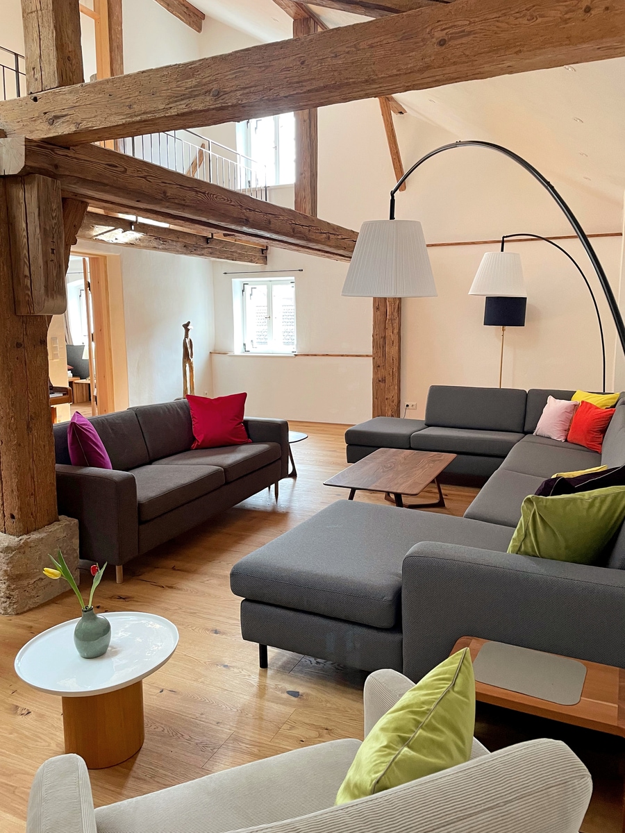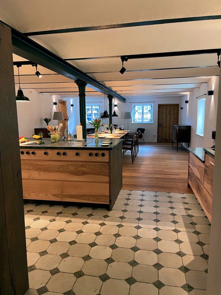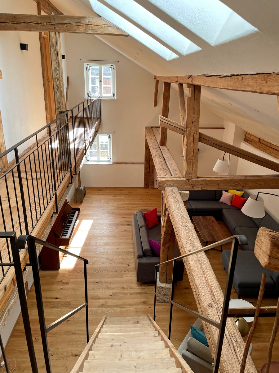 Für den umweltbewussten Heimatbewahrer ist ein Abriss zudem eine unnötige Ressourcenverschwendung. Er ist überzeugt: „Es gibt kaum ein besseres Beispiel für Nachhaltigkeit als ein saniertes, denkmalgeschütztes altes Haus.“ Zumindest, wenn man saniert wie Hans Well: Alles, was sich irgendwie erhalten lässt, wird erhalten – auch im „Brui“, das mit „Bräu“ übersetzt werden kann und so heißt, weil hier einst der wohlbetuchte Braumeister des Dorfes wohnte. Von den über 30 originalen Innentüren sind bis auf zwei alle restauriert worden – jede Einzelne ein Unikat. Die 200 Jahre alte Kassettendecke des Empfangsraums war braun-schwarz, bevor Well sie nach Absprache mit einem Restaurator mit einem Spiritus-Wasser-Gemisch abwusch und wieder die natürliche Bierlasur zum Vorschein kam. Drei lange Jahre haben er, seine Familie und die Handwerker seines Vertrauens für die Sanierung des 350 Quadratmeter großen Hauses gebraucht, das mit seiner Wärmepumpe und der Wand- und Fußbodenheizung den Niedrigenergiestandard erfüllt. „Dafür ist der Brui bis jetzt das bestgelungene Haus, das ich gemacht habe“, meint Well. Das Highlight ist die ehemalige Tenne, die zu einer Galerie mit frei liegenden Balken umgebaut wurde, mit Spotlights an der Decke und solarbetriebenen Dachfenstern. Dass Well aus ihr erstmal zehn Container verrottetes Heu und Stroh rausschaffen musste, kann man sich kaum vorstellen.