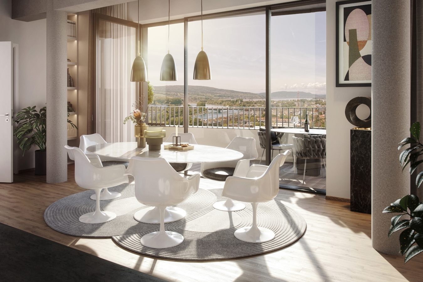 Die Innenräume der Wohnungen sind gleichermaßen weitläufig wie komfortabel. Aufgrund der sorgfältig ausgewählten Materialien entsteht ein elegantes sowie modernes Lebensgefühl. Große Betonsäulen sowie die Träger geben dem Wohnraum einen Rahmen im puristischen Stil. Zusammen mit Naturmaterialien, wie bei den Holzböden in hellen Farbtönen, ergibt sich ein harmonisches Ambiente.