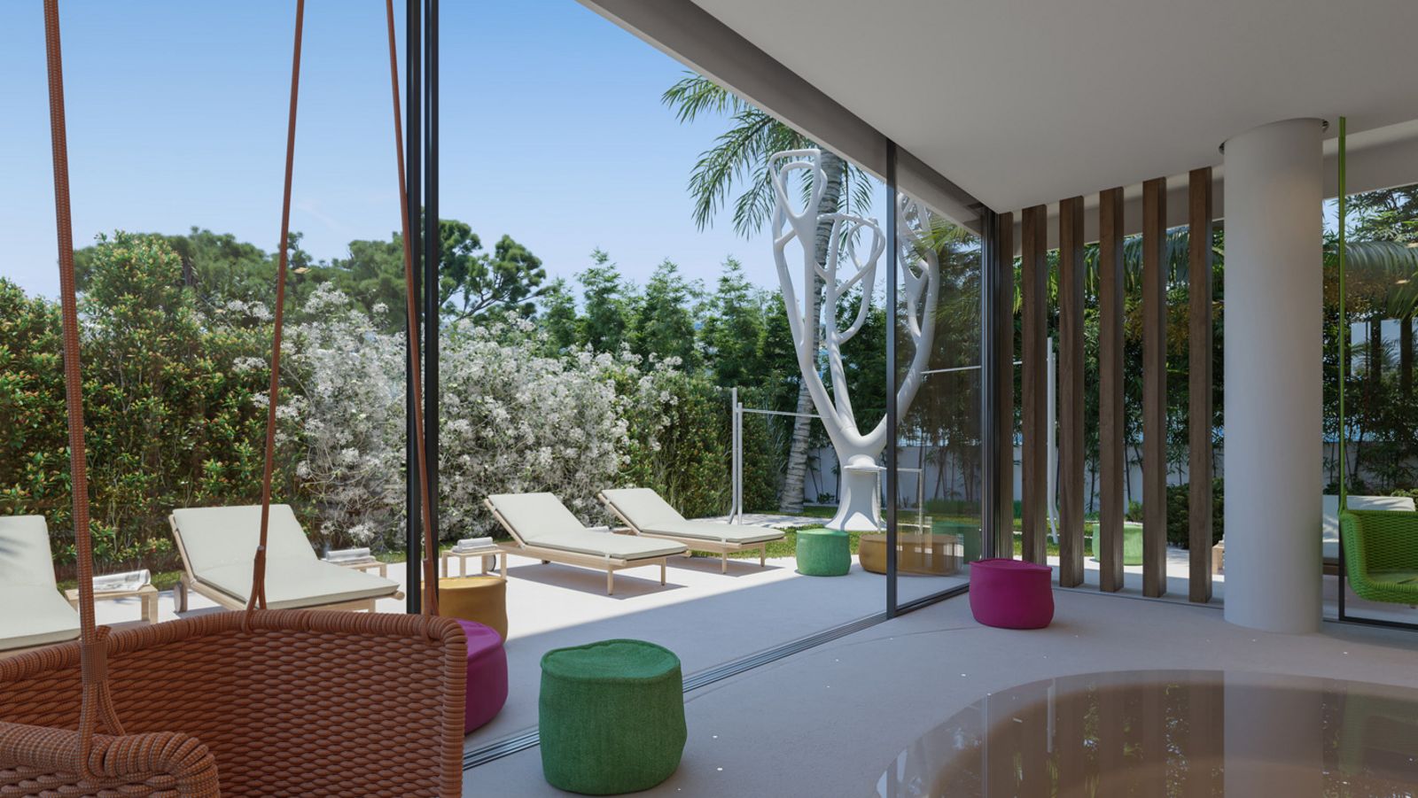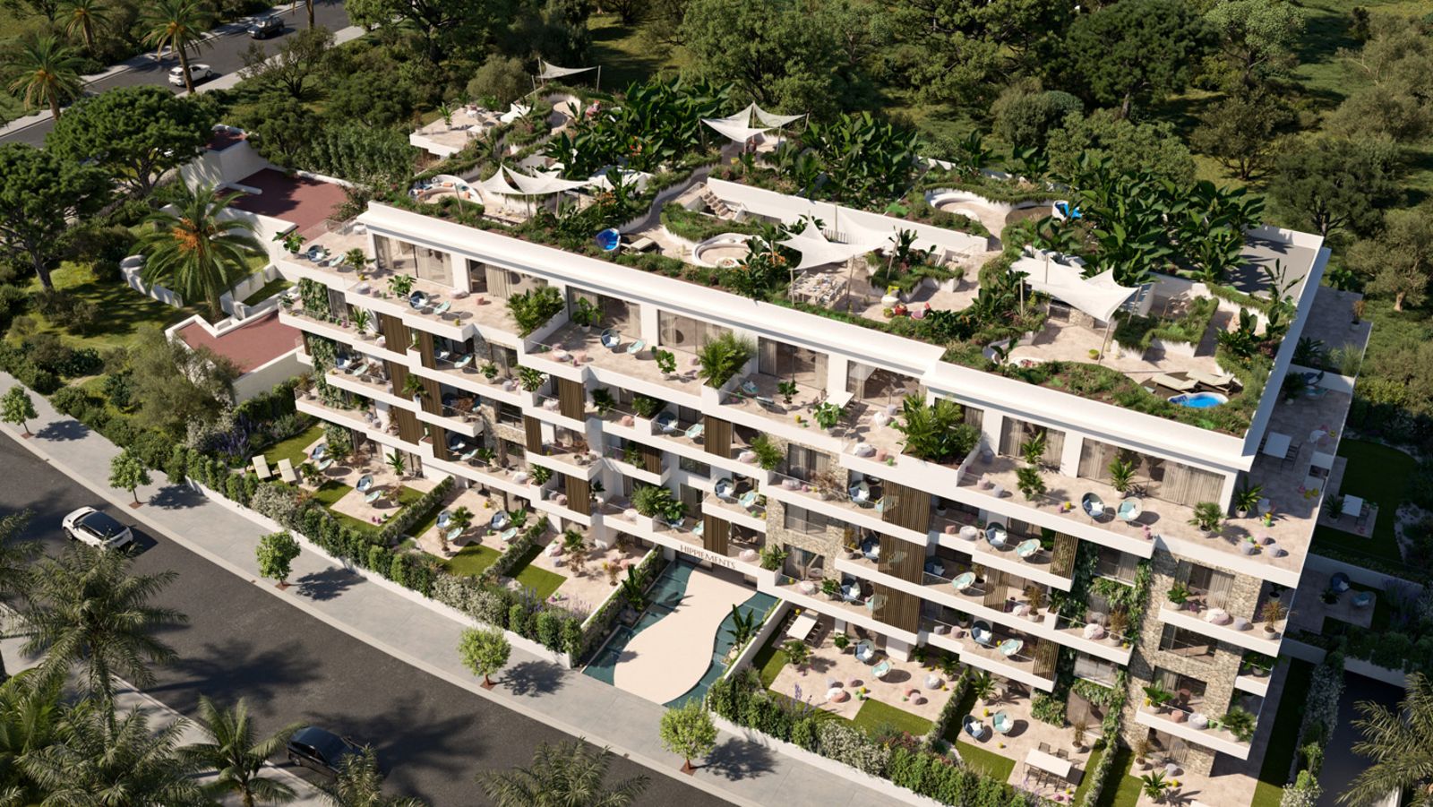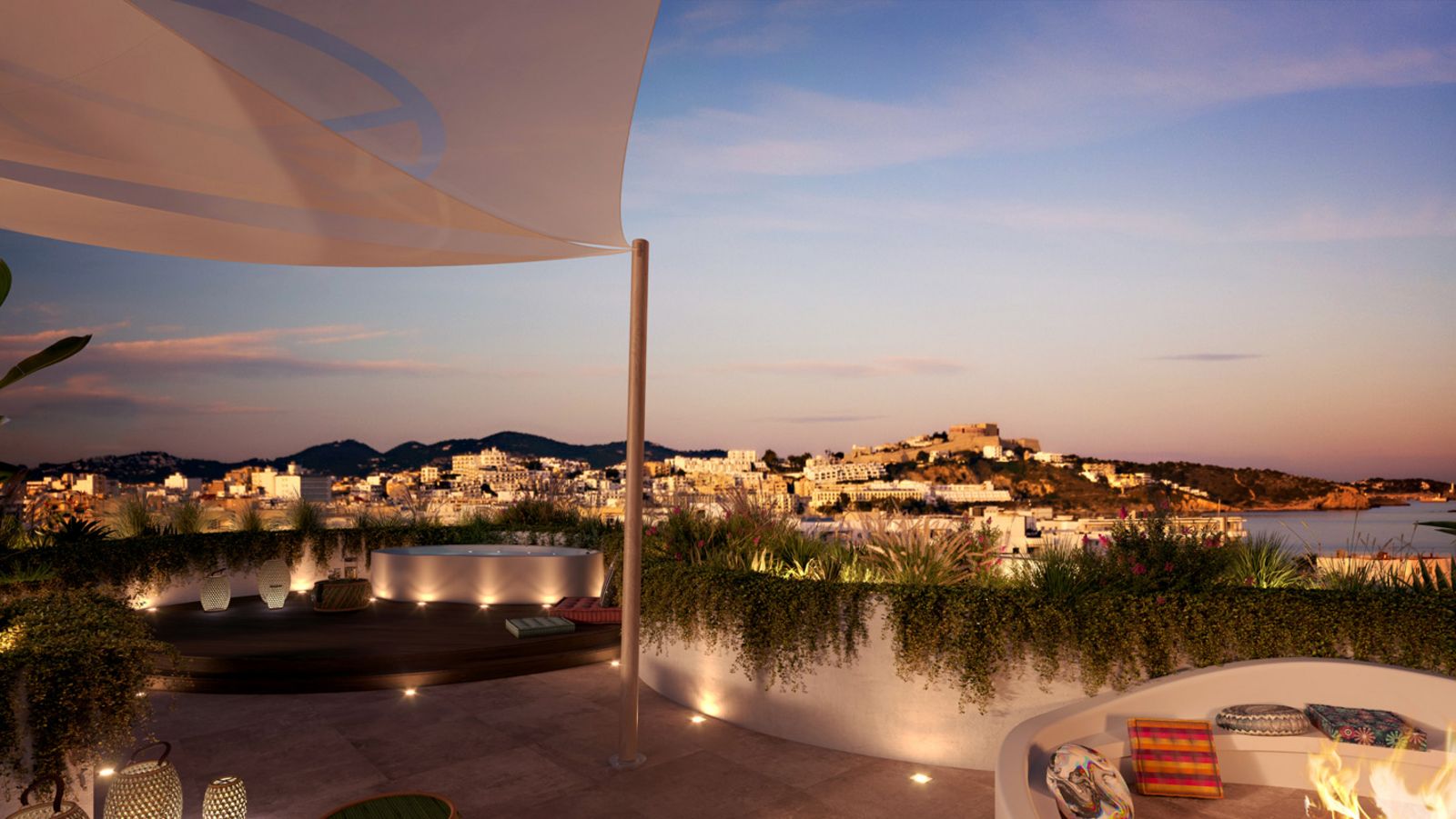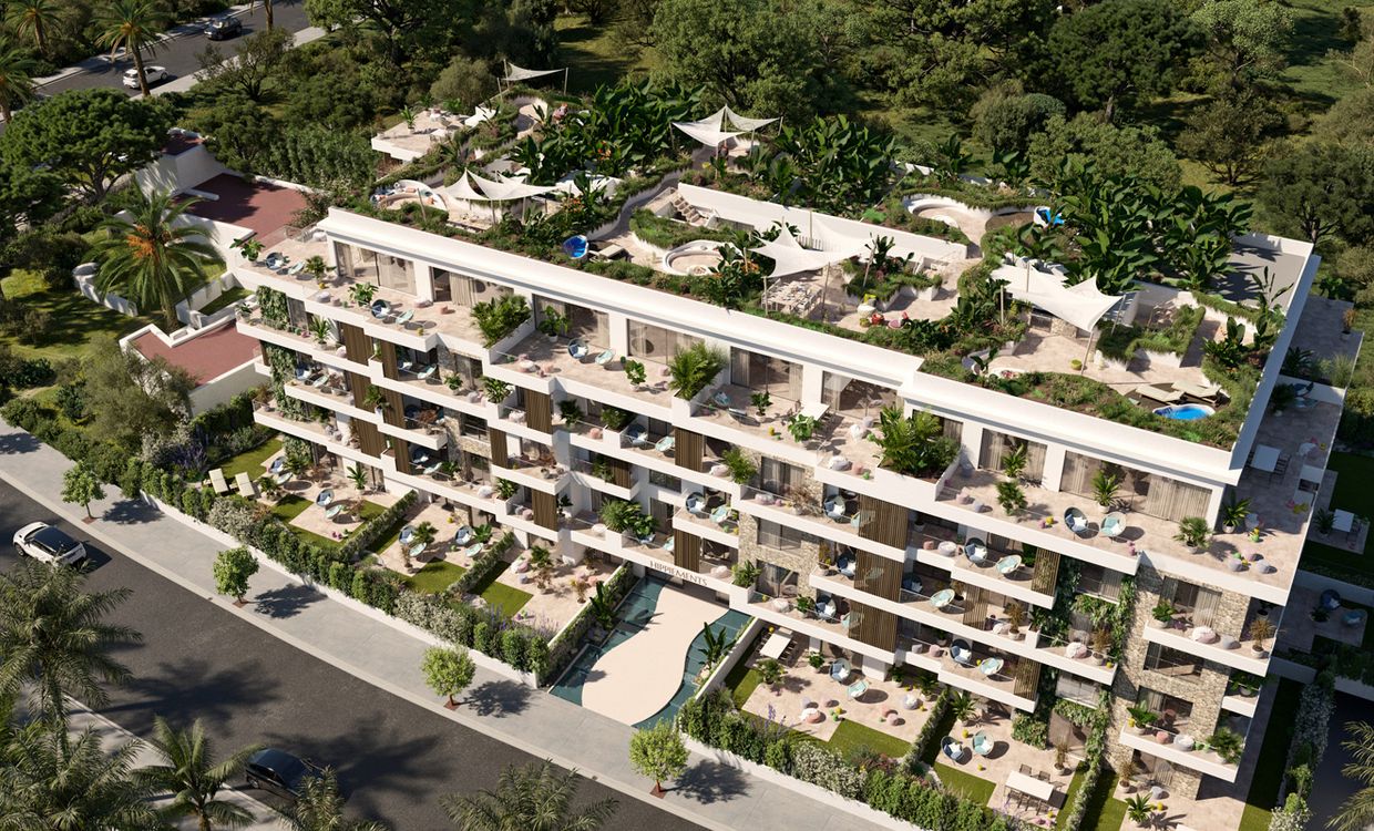 Das architektonische Apartmenthaus liegt zehn Minuten vom Flughafen, fünf Minuten von Ibiza- Stadt und eine Gehminute vom Strand entfernt. Die 63 Wohneinheiten – beginnend beim kompakten Apartment mit 60 Quadratmetern über familienfreundliche Wohnungen bis zu Penthouses mit Dachgärten, Jacuzzi und vollintegrierten BBQ-Außenküchen – sind kurz vor Fertigstellung.