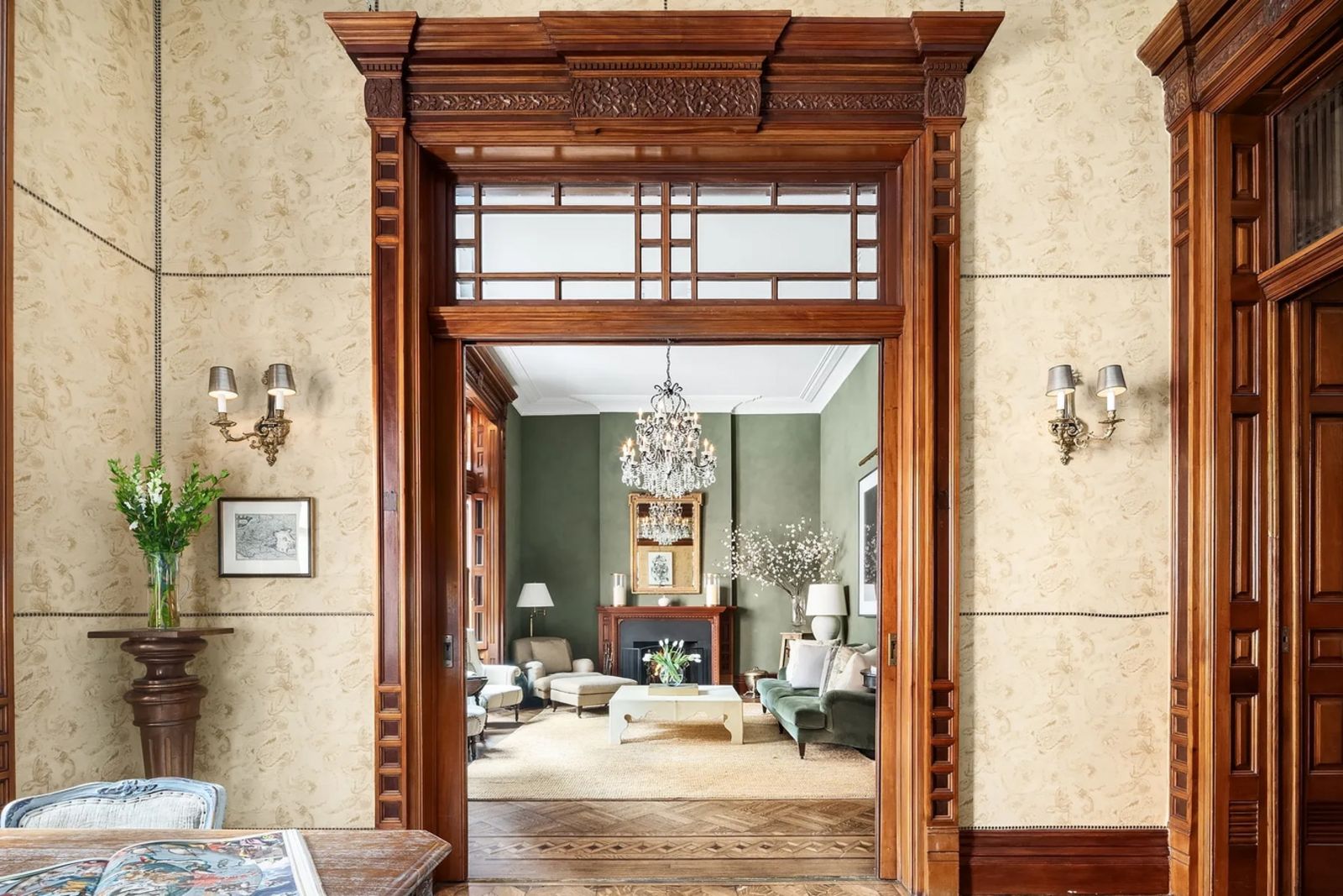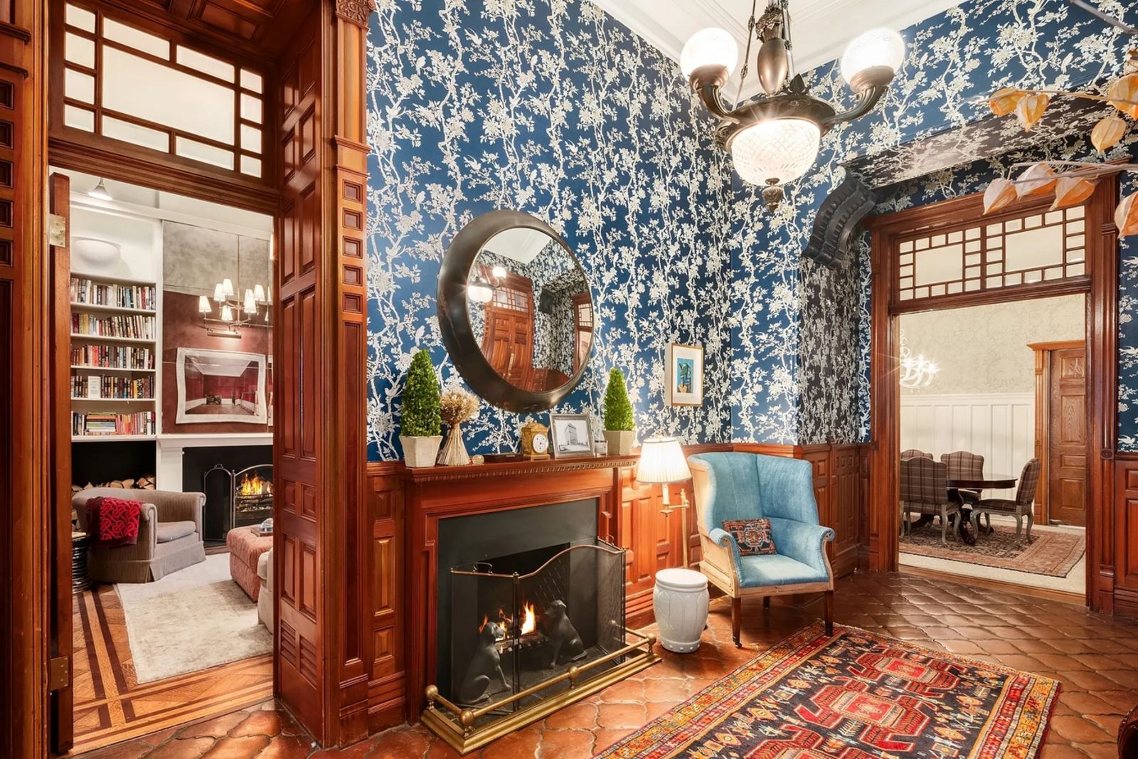 Im lichtdurchfluteten Wohnzimmer fallen die restaurierten Mahagoni-Täfelungen, aufwendig geschnitzte Türen und Fenster und einen ganz besonderen Erker mit von Tiffany Studio erstellten Bleiglas-Spiegeln sofort ins Auge. Hier befindet sich auch einer der insgesamt 5 offenen Kamine.