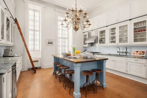 Vor der Küche befindet sich ein formales Esszimmer mit lackierten Wänden und eingebauten Fenstersitzen. Die Wohnküche hat eine ca. 14 Meter hohe Decke mit Drehleiter, die sowohl praktisch ist als auch als Designelement fungiert.